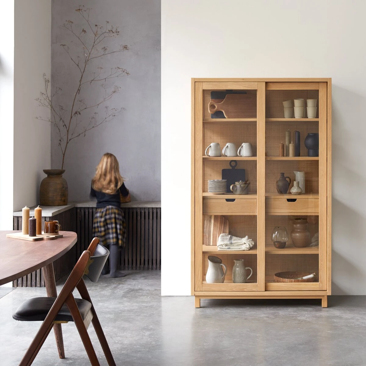 Elegant understatement and stylish details characterise the Adel solid oak dresser. It is the ideal way to display your favourite crockery and ornaments. We like the purity of the lines and the pale golden colour of the wood that make it incredibly versatile style-wise. The finishes bring nature into the home, with the base covered with wicker canework providing the softness of natural materials, an influence that’s right in line with current trends. Check out the practical drawers for cutlery, napkins and all those little things that you don’t want cluttering up your … and the sliding doors that mean you can set it up without worrying about the space occupied by open doors.