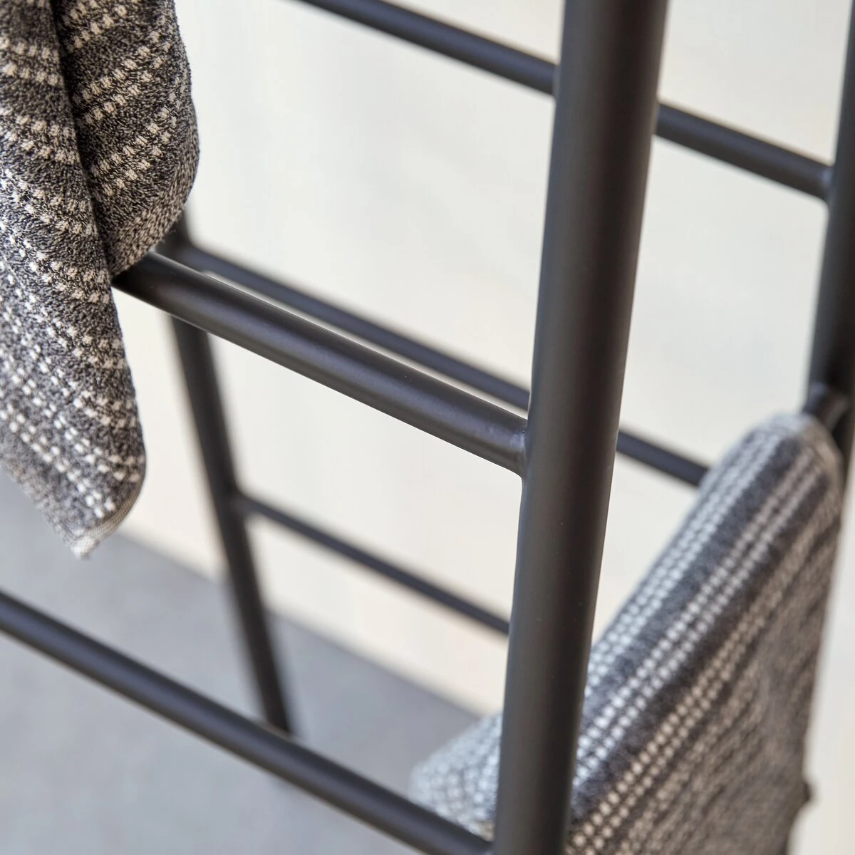 The industrial-inspired Adja metal towel rack combines contemporary elegance with originality. This very functional rack will hold hand towels, bath towels and bath mats – each on its own rung! Compact, but with plenty of space, it can be used in a or cloakroom, or can be reappropriated as a place to hang coats in an entrance hall, as a valet , or even as a magazine rack or as a place to hang ties or scarves. Get creative!