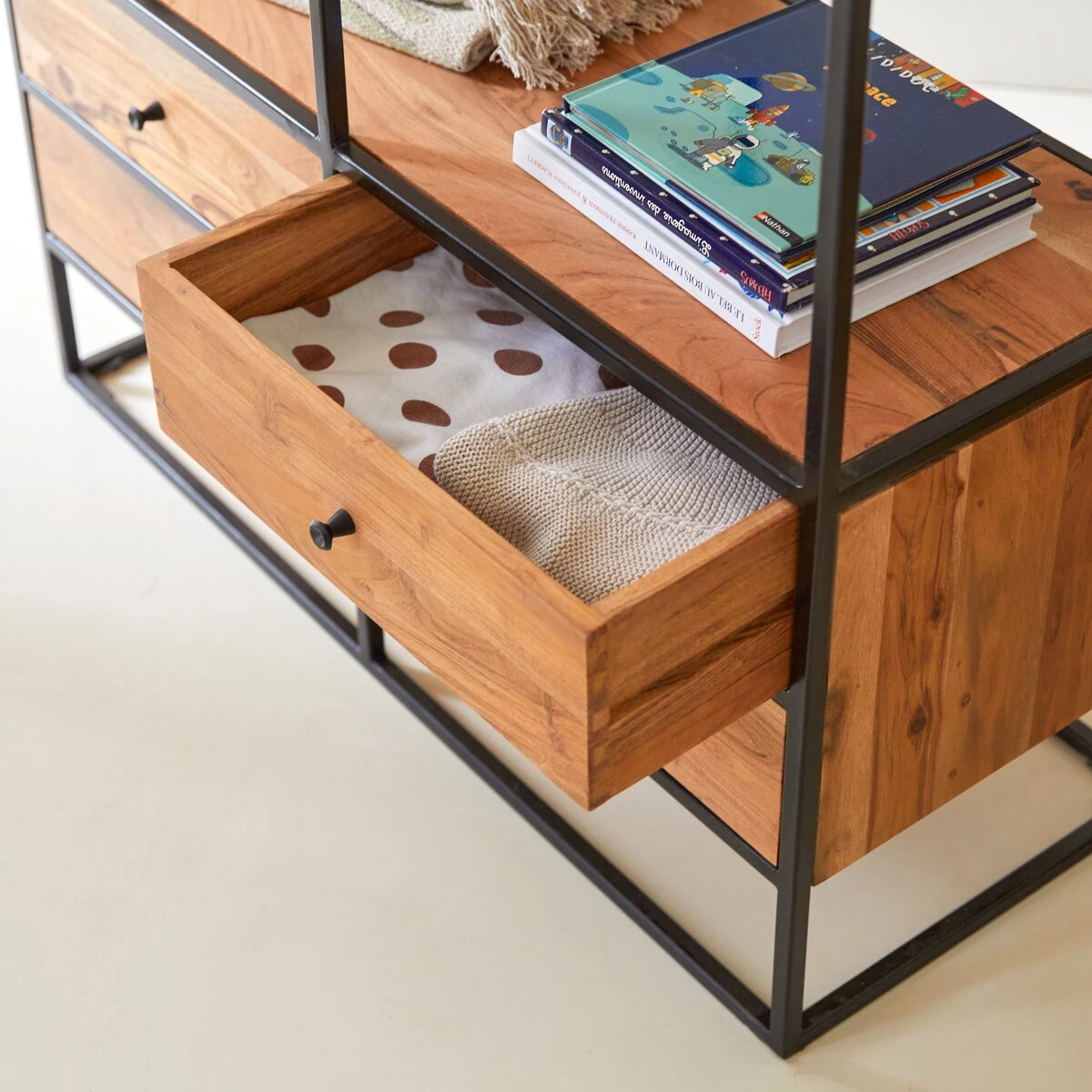 If, like your child, you’re enchanted by the playful, industrial appeal of the Agra solid acacia and metal bookcase, then take a look at the other pieces in . Try mixing and matching them with other items from our