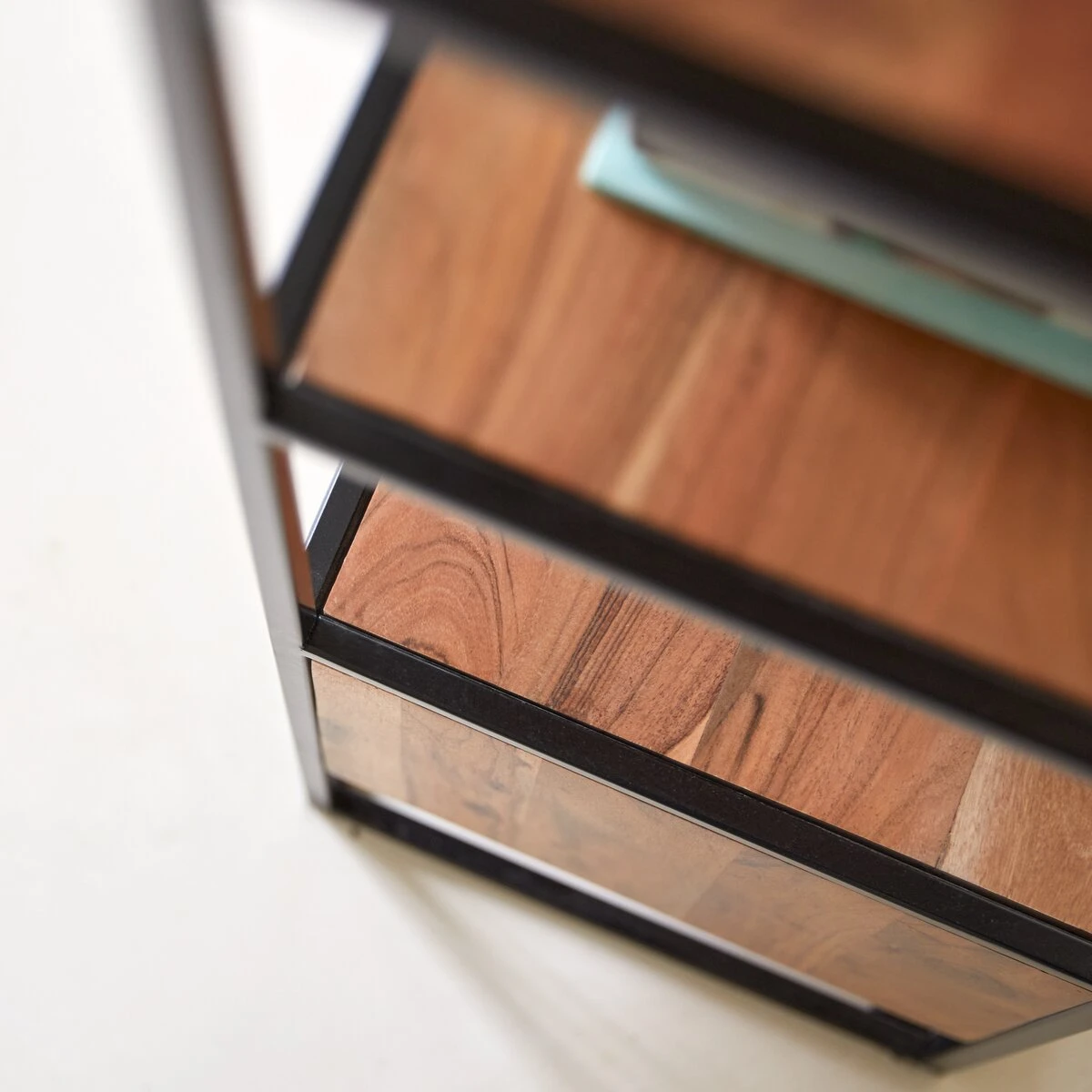 The Agra solid acacia FSC® certified and metal bookcase will spark your child’s imagination: a treasure hunt in an exotic country or a journey back in time to the factories where their grandparents once worked, a never-ending supply of dreams and adventures to have! Tidying things away becomes a source of joy: little treasures can be hidden in the drawers and homemade masterpieces and board games can be displayed on the different shelves and sections. And when a child organises their own space, they become more autonomous… they grow up!