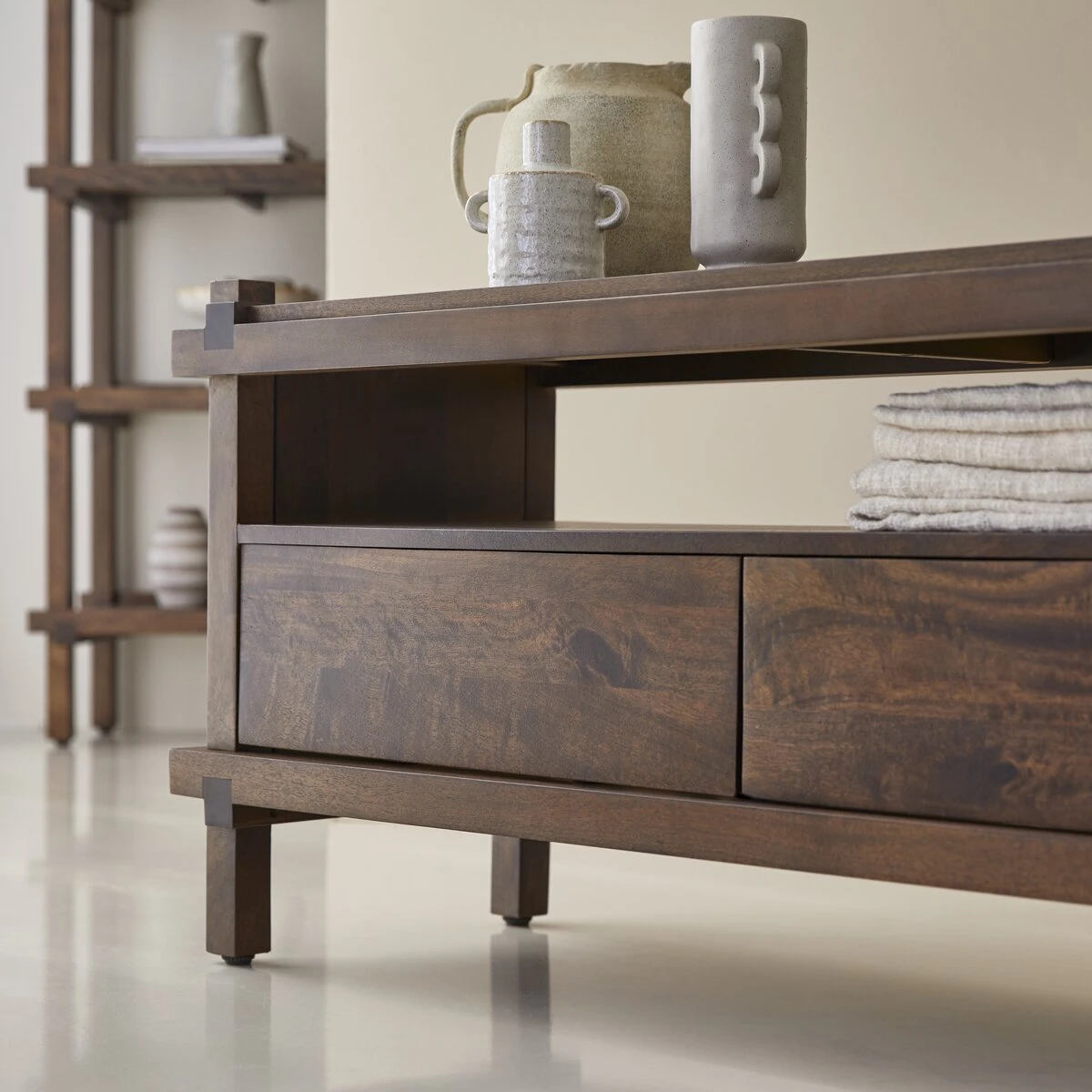 Give in to the charm of the Arko TV stand in solid mango wood! Ideal for organising all your multimedia equipment and essential accessories such as remote controls, boxes, magazines etc. We love its great storage capacity and deep colour with beautiful reflections.