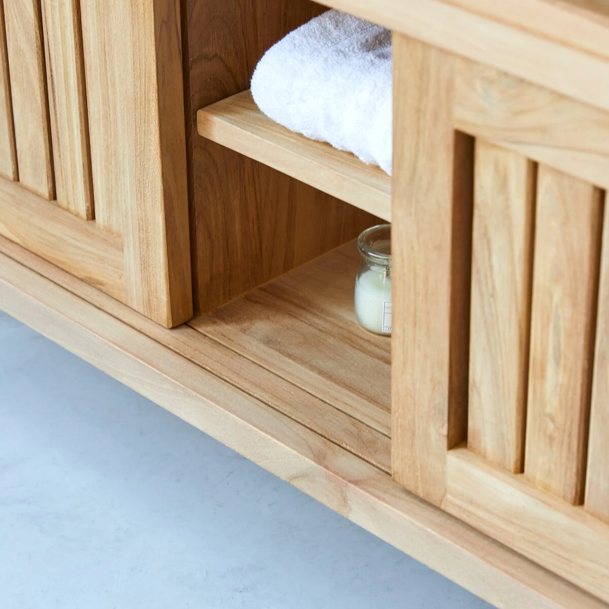 On the practical side, everything can be kept tidy and organised on the shelves and in the 2 cupboards (sliding doors). The blond teak brings warmth to all bathrooms and laminated wood. It can awaken and invigorate your bathroom.