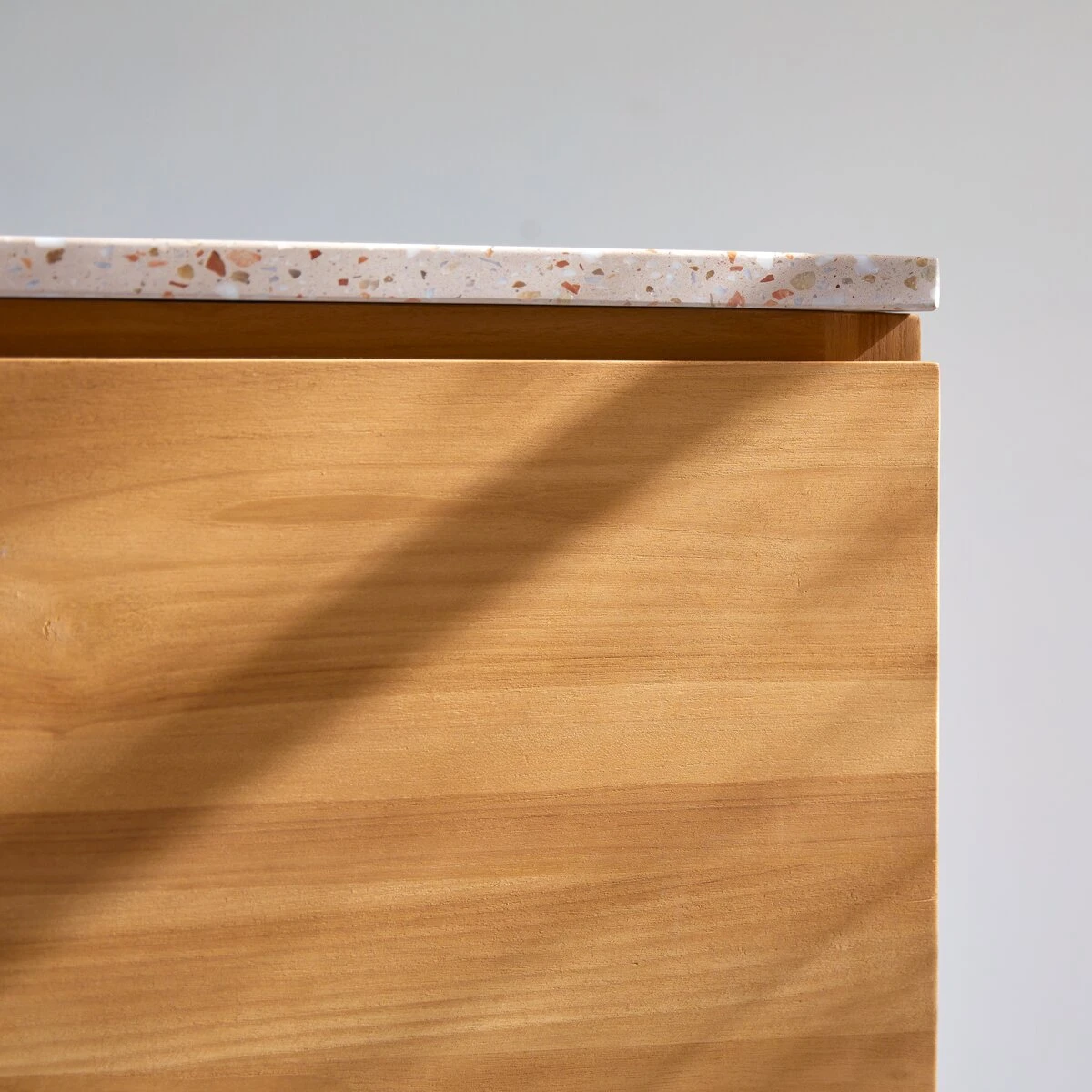 The Edgar vanity unit in solid teak and premium pink terrazzo is also available in a 120-cm version fitted with a double washbasin. It is also available with a washbasin in premium Moon Terrazzo in 80-cm and 120-cm versions.