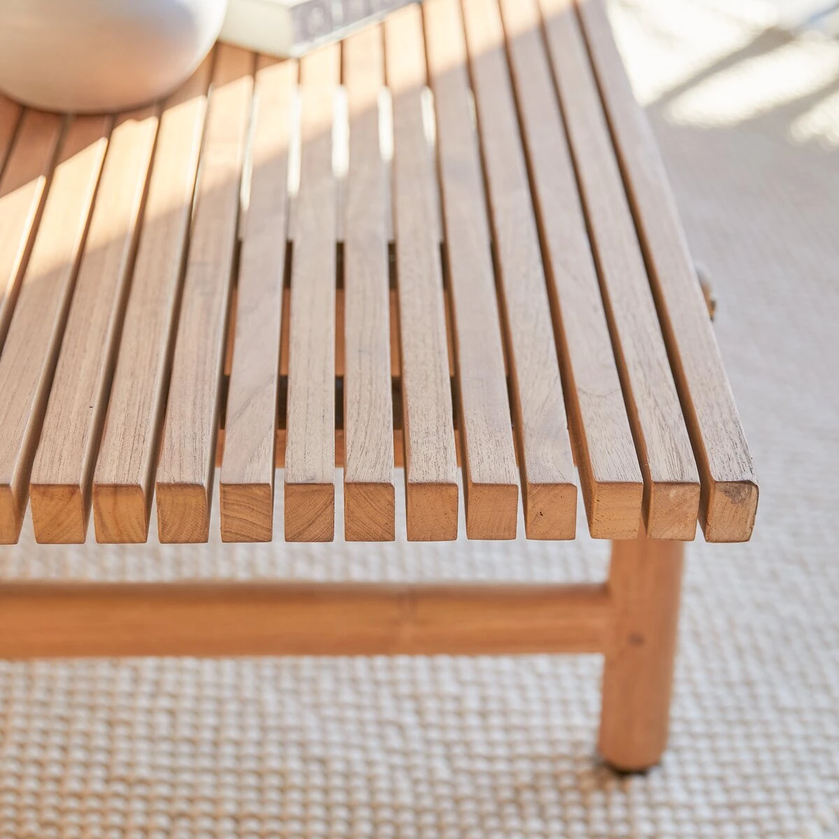 A premium piece of furniture that combines top-quality features and contemporary design, the Fado solid teak coffee table has beautifully understated lines, a superb slatted top, with a recess that provides a perfect place to put objects that would tend to roll or to display trinkets, and legs that are designed to visually lighten the piece.