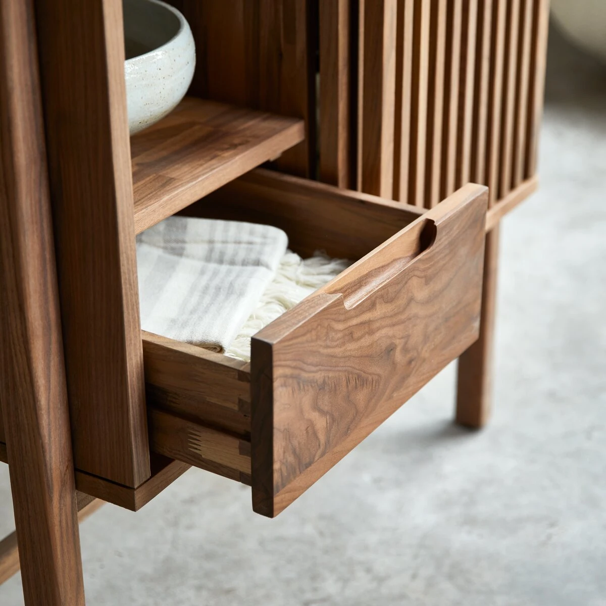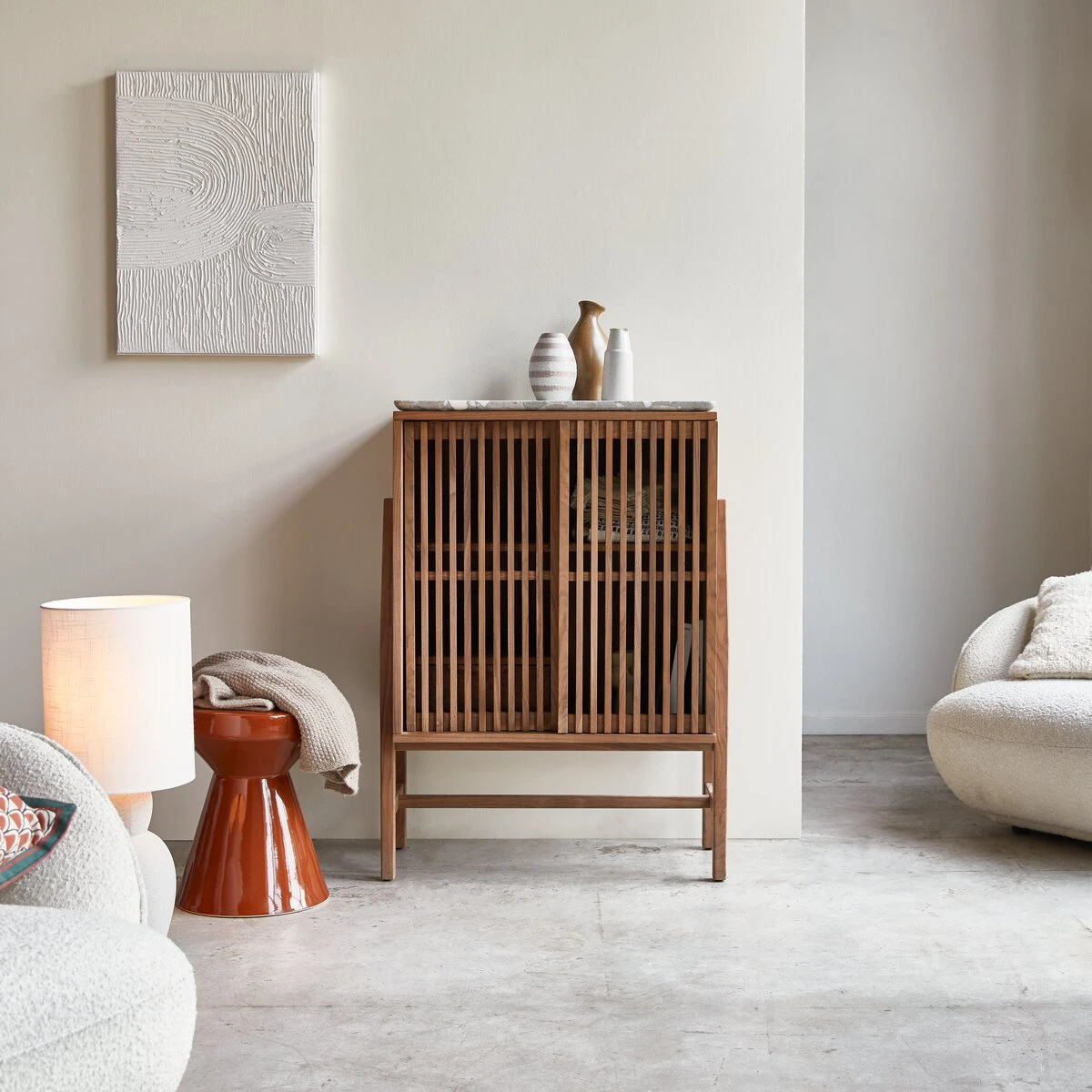 A sideboard in solid walnut and premium terrazzo: a high quality piece of furniture that combines the perfection of exceptional materials with an unusual aesthetic. Utterly charming! We like the details of its slatted doors so you can play with the colours and materials of the contents, the base designed to make the whole piece of furniture that much lighter and the premium terrazzo top… This material is as beautiful as marble, stands up incredibly well to everyday accidents and has wonderfully pastel tones, with subtle touches of grey, very light brown, and light orange. Clearly not furniture you would find in just anybody’s home.