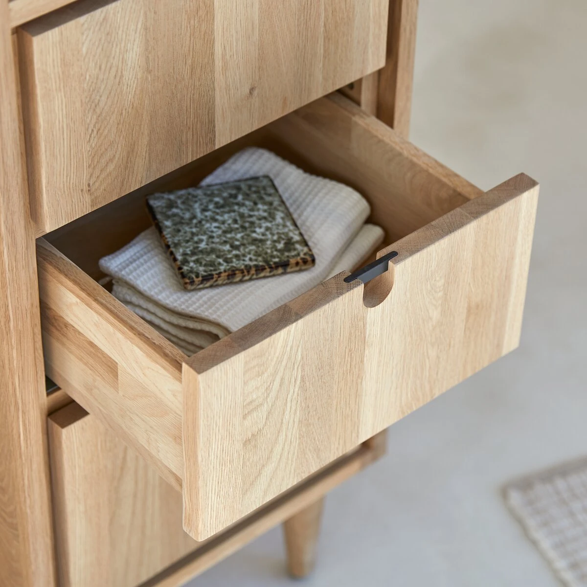 The Jonàk Oak tall bathroom unit blends very distinctive Scandinavian style with generous storage capacity whilst occupying a minimum of floor space. The top cupboard can be used to store bathroom linens and the three drawers offer plenty of room for bottles and beauty products. The central compartment can also be used to display elegantly folded towels or attractive ornaments.