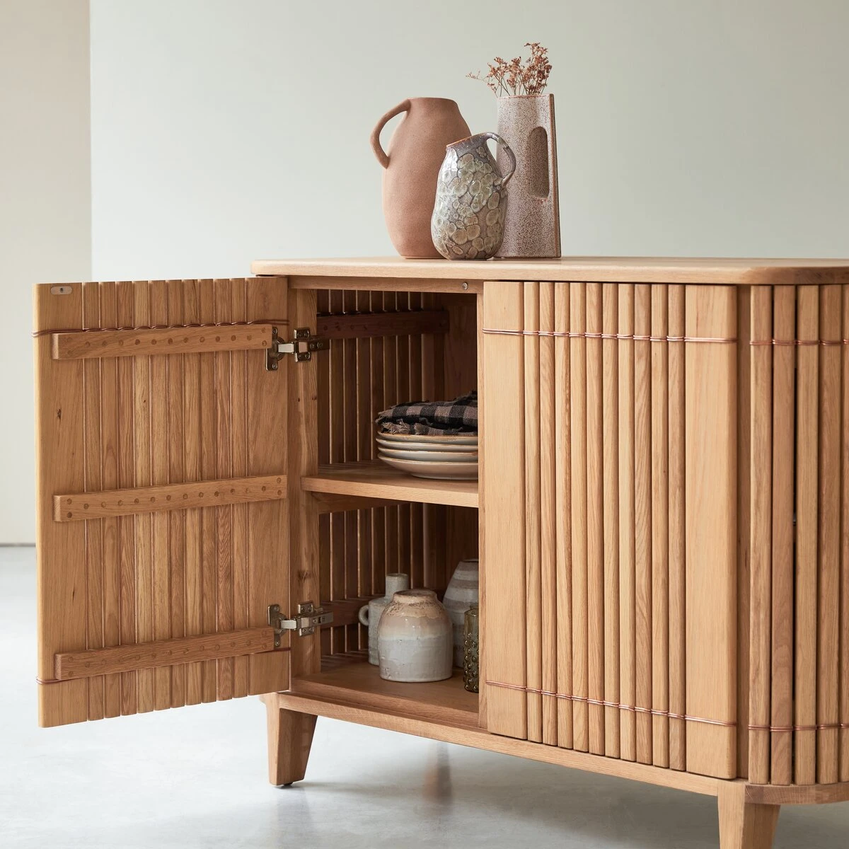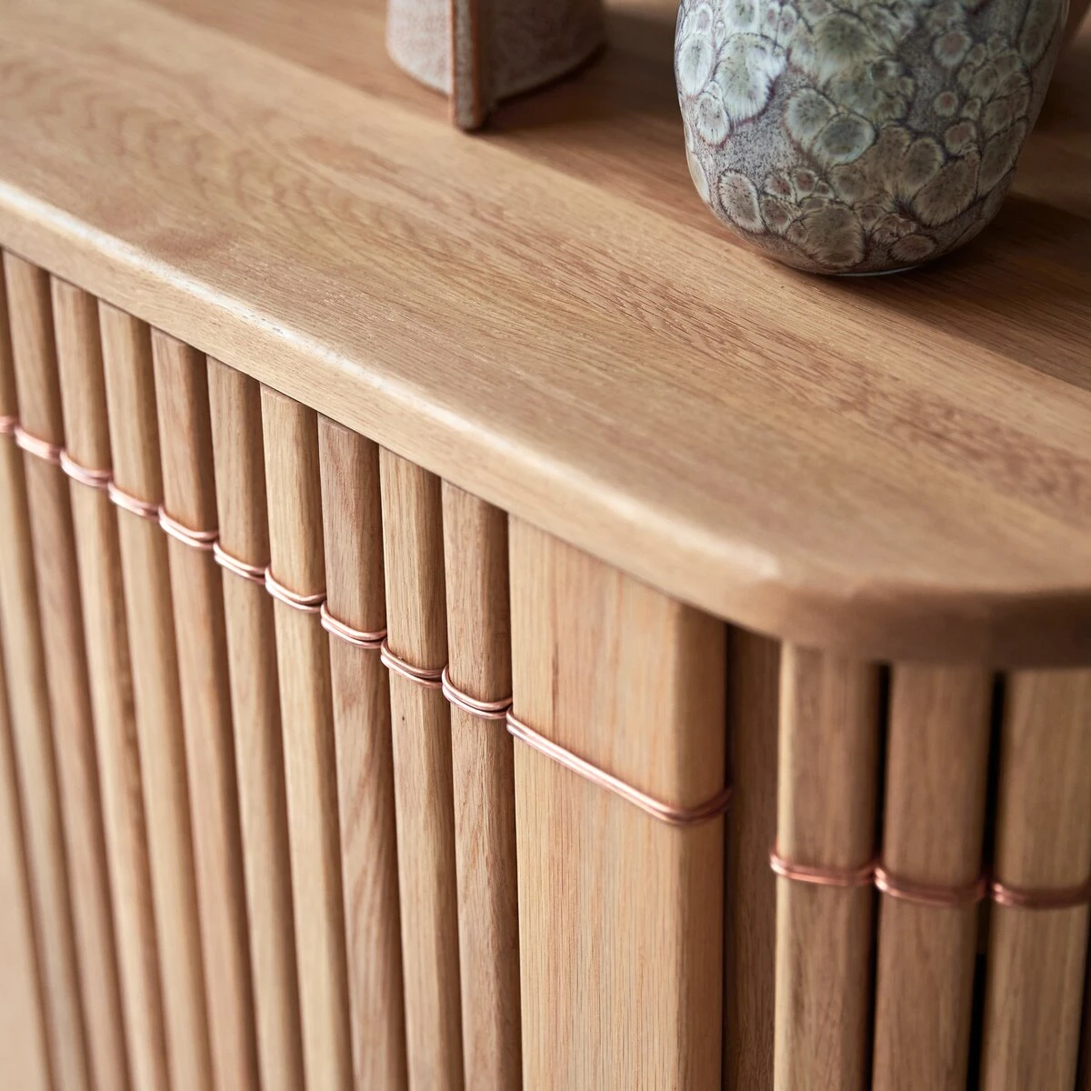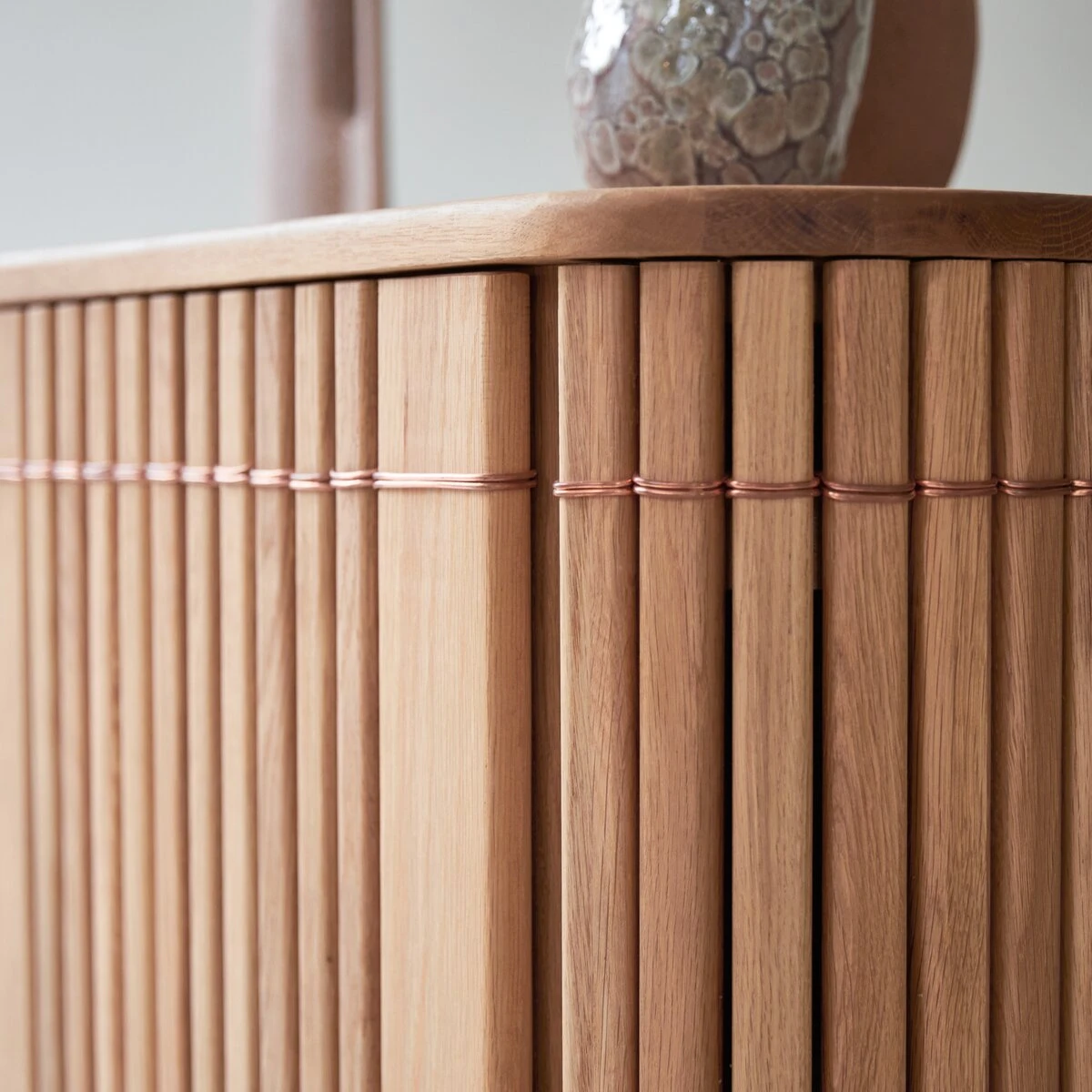 Inspired by the Art Deco style from which it draws its finesse and understated elegance, the Koppar oak sideboard 115 by Karpenter combines the authenticity of solid wood, the refinement of a copper wire details and stunning high-quality craftsmanship: each of the slats is fitted by hand.