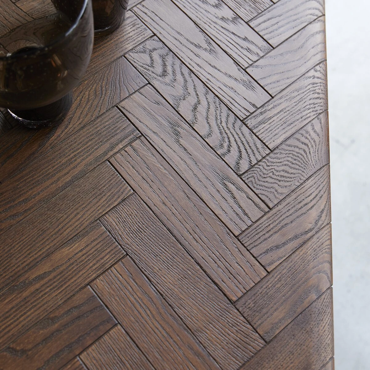 The Mahkah solid oak dining table by Bleu Nature features a beautifully worked top in herringbone pattern pieces of wood.