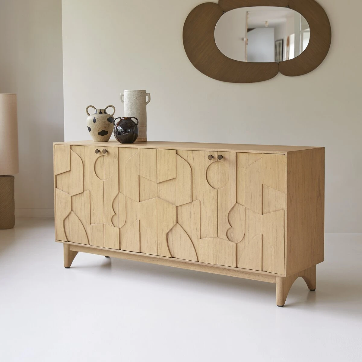 Natural style combined with the originality of a highly visual cut-out front: the Otho dresser in solid mindi is a truly remarkable and eye-catching piece of furniture! We love the light-coloured wood which blends easily with any interior décor, the scrolled cut-outs on the doors and the generous storage capacity! Varnished for ease of use on a daily basis, this superb dresser will bring a graphic touch to your dining room… It looks equally stylish in a large kitchen and is just what you need to organise your crockery and pots and pans, or you can use it in the bedroom for folded clothes and bed linen…