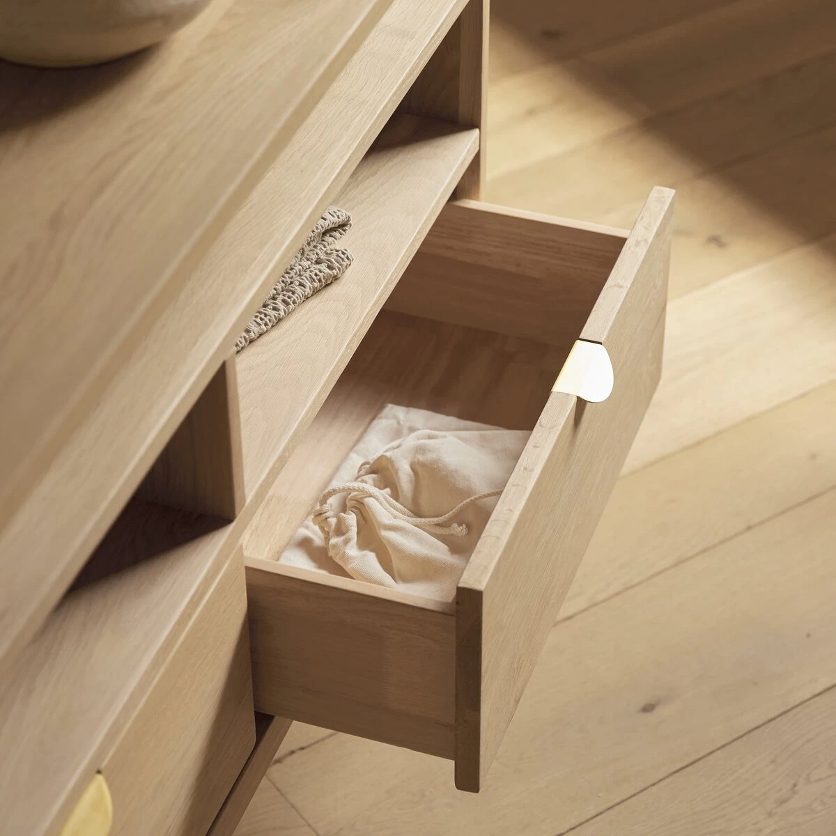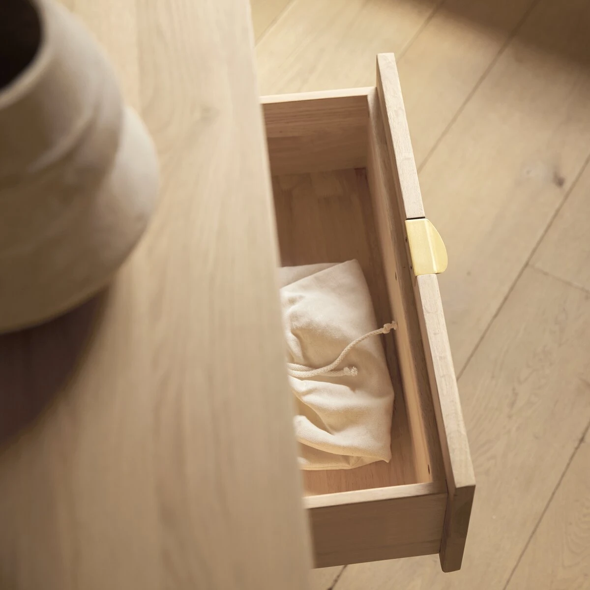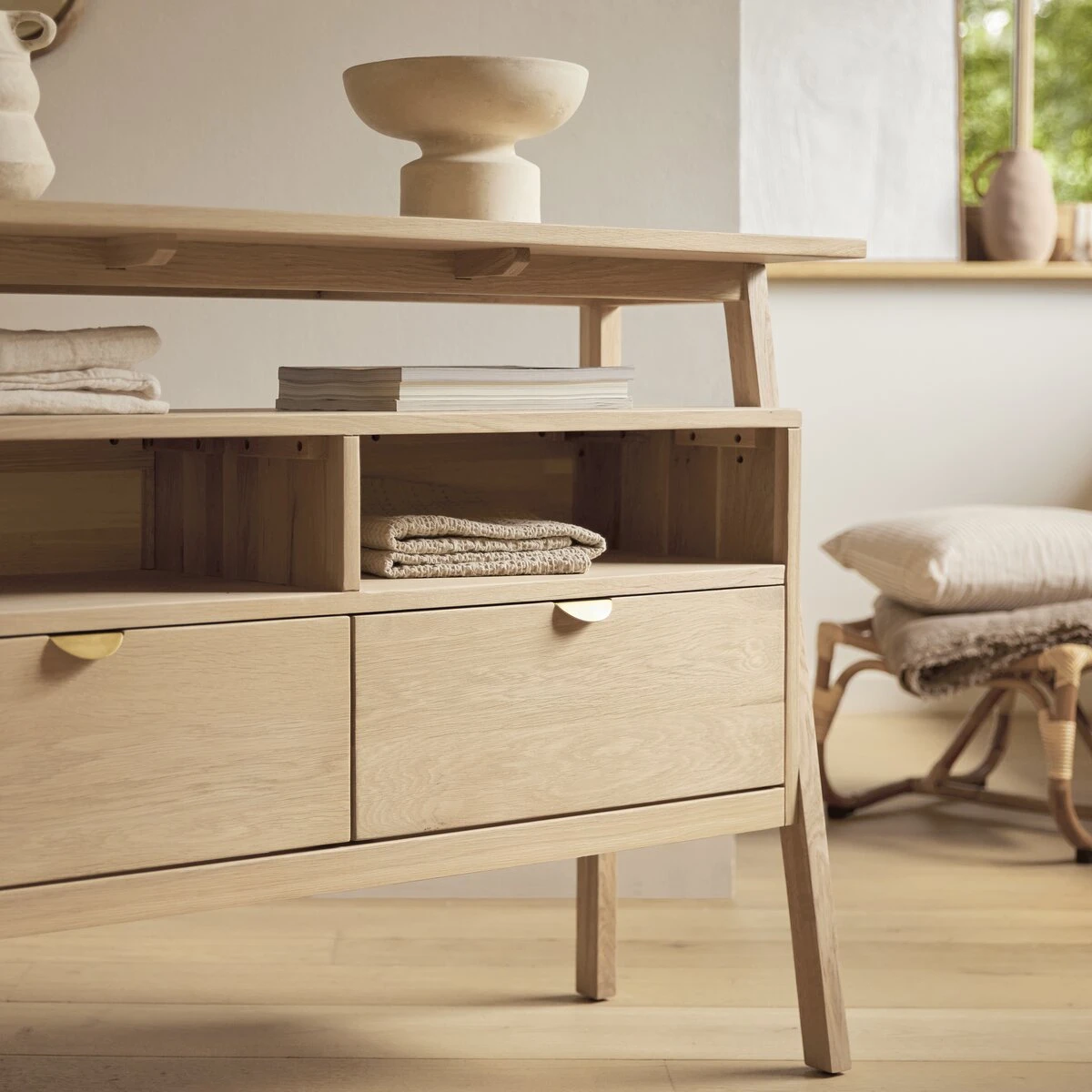 The Pola solid oak console table can be used as a small sideboard, TV bench or in the hallway, depending on what you want and need! We love the Scandinavian influence elevated by modern details like the diagonal base and the raised top. We also love the compartment that lightens the whole piece visually. Note the copious storage capacity organised in two compartments and two large drawers. The Pola oak console table is sleek and stylish and looks at home in any room in the house: for accessories and magazines, for crockery or table linen, in the office for files, for underwear… even in the hallway for bags and storing hats and gloves.