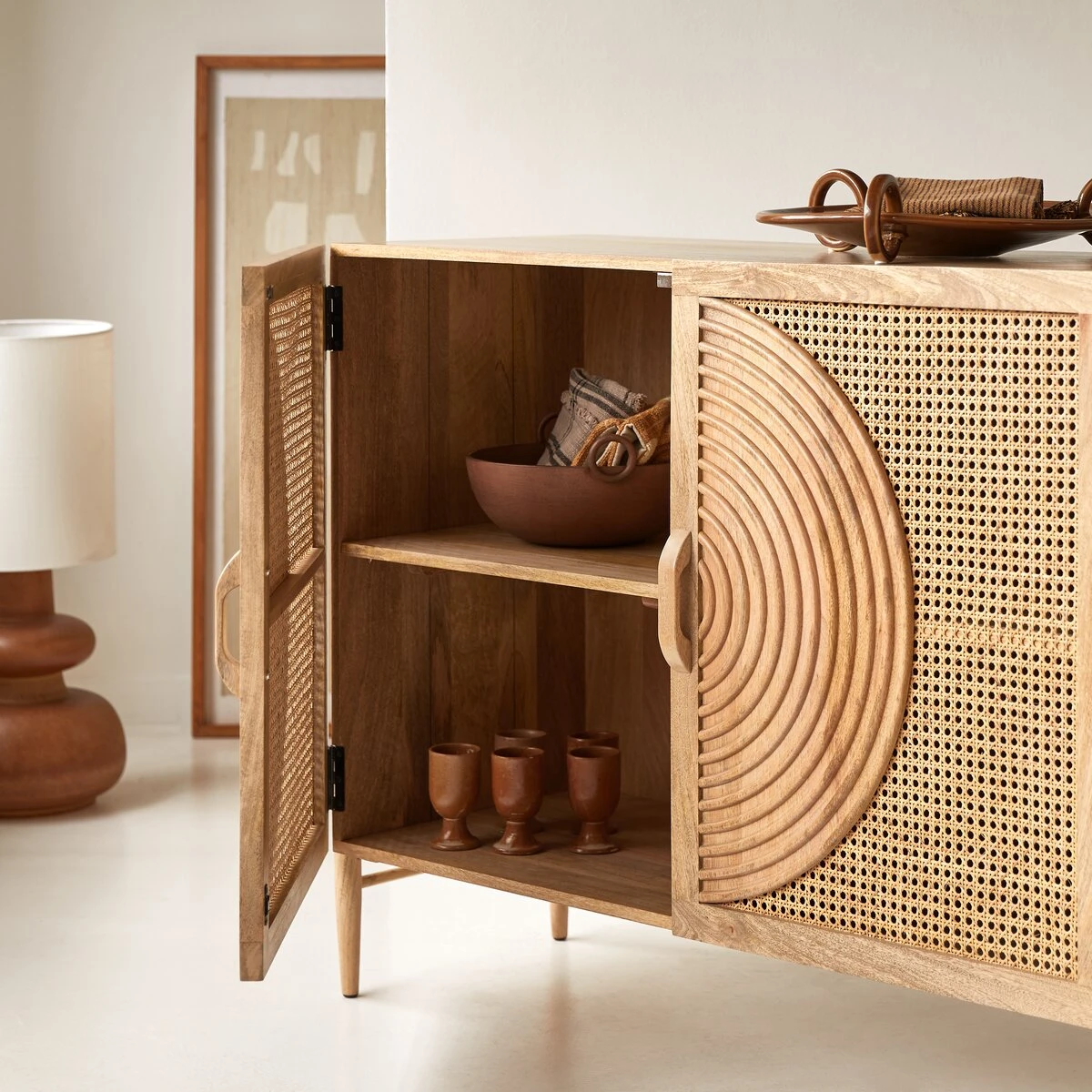 The Sina sideboard in solid mango and rattan can easily be installed in the bedroom, the study or a spacious hallway. It can also easily be placed in the living room to store dishes, bottles or table linen. Varnished for easy everyday use, it can also be combined with the furniture from our .