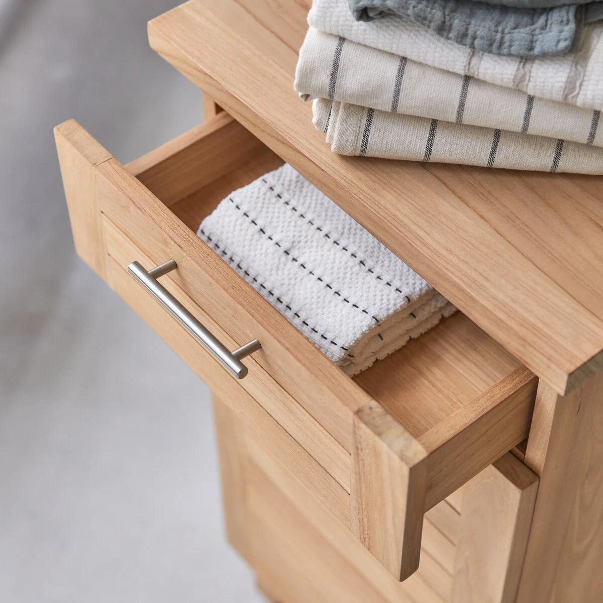 Tikamoon presents the Soho, raw teak wood bathroom collectio, which is characteoirsed by simple lines and the warm colour tone fo the wood. This is the, the lower Soho storage module, a highly convenient cabinet that is ideal for organising your toiletries or bath textiles. It is equipped with a drawer and a cupboard, which opens to two shelves.