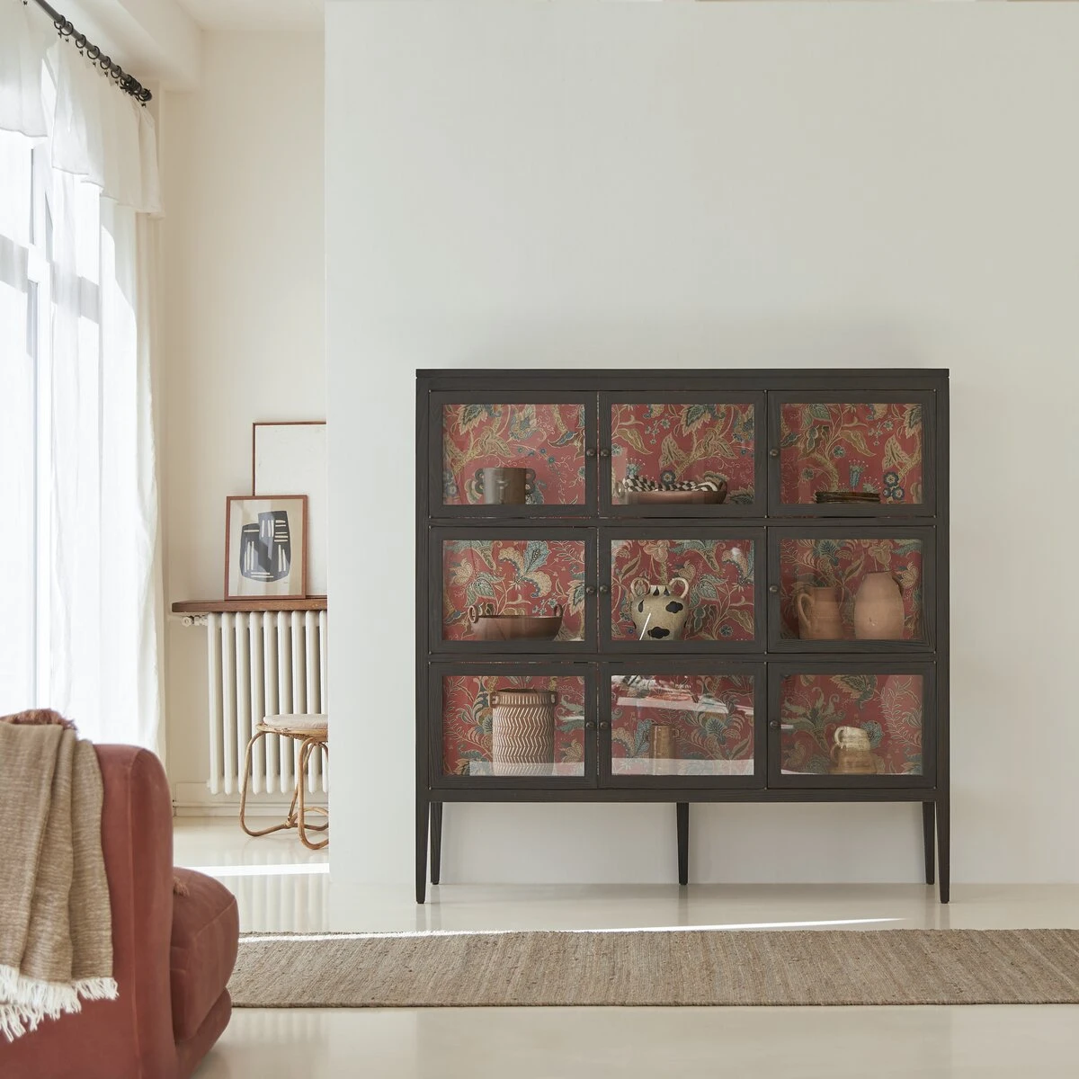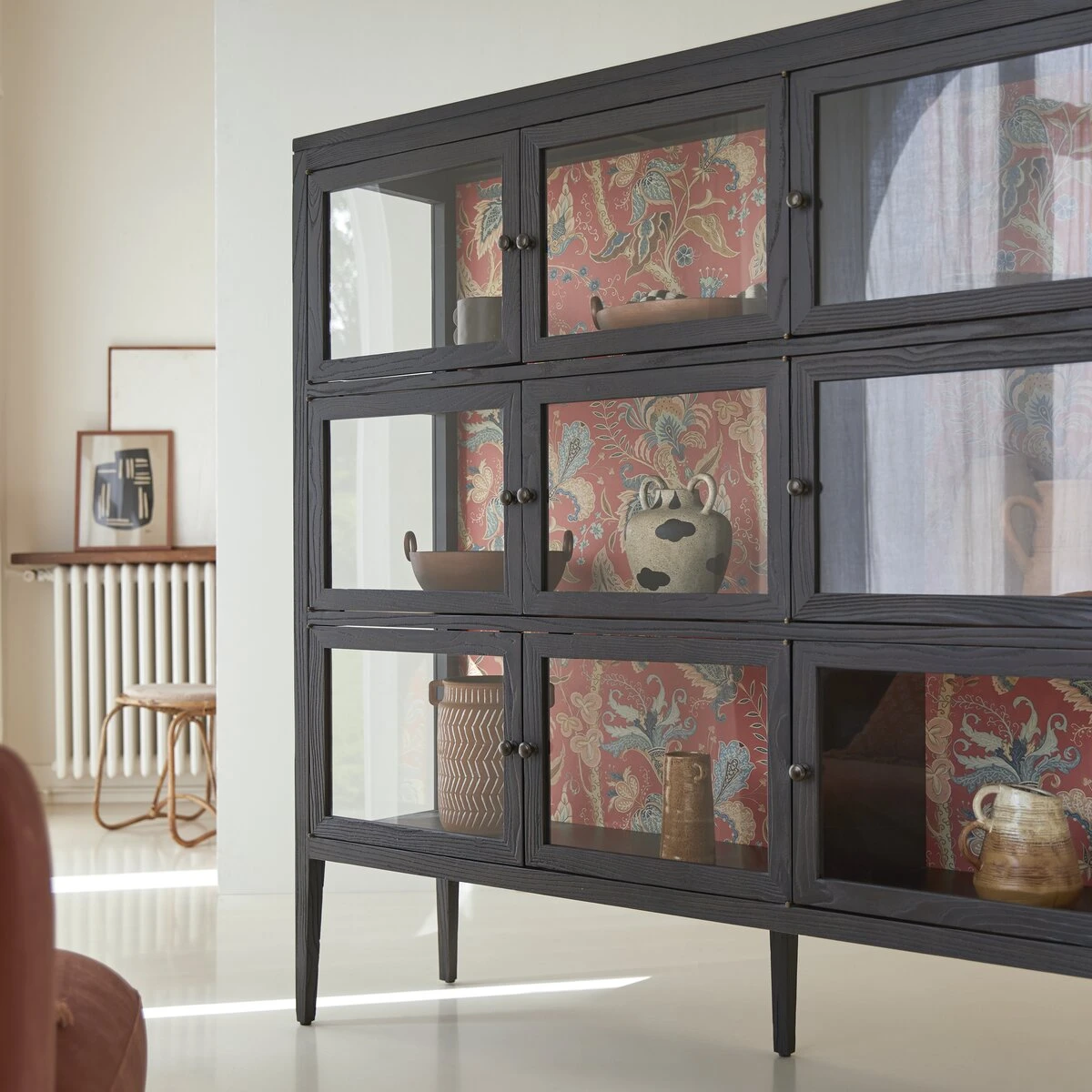The Chinese-inspired wallpaper on the back of the Tana wide elm display cabinet adds character, charm and elegance to this piece of furniture, whose exotic appeal will put you in holiday mood! Ideal for displaying your most beautiful objects, it can also be used as a bookcase or to hold your best crockery – the choice is yours! So pretty that you’ll be tempted to leave it empty to admire its inherent charm, this display case is crafted in an indisputably elegant noble wood: elm is very popular with contemporary designers.