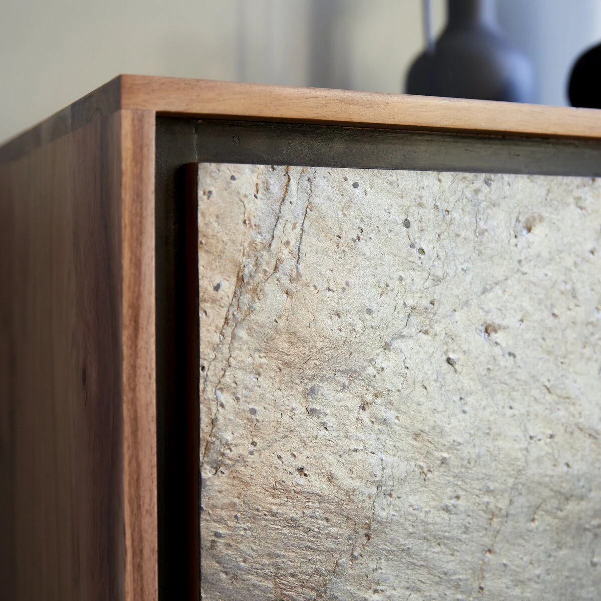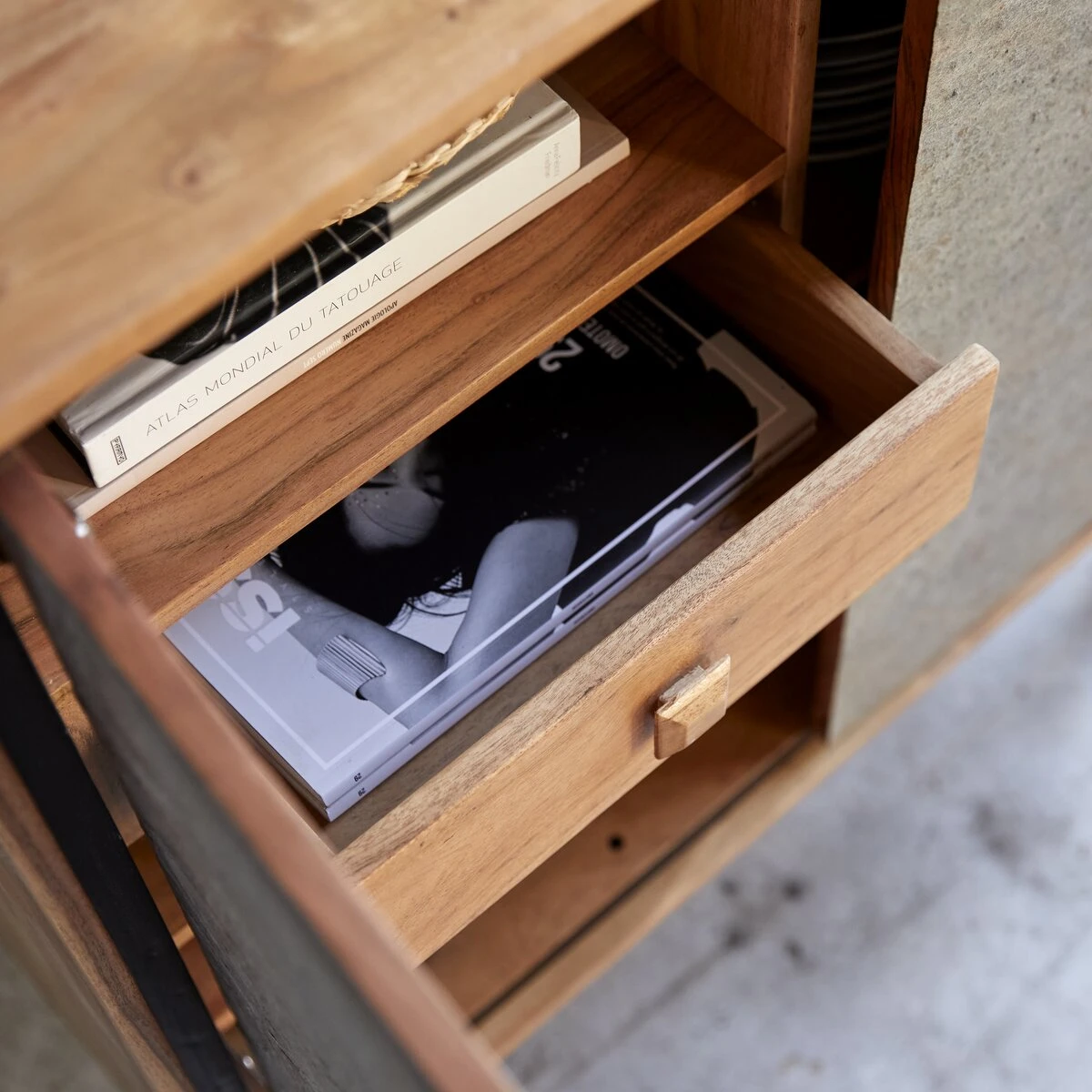 The Temis sideboard is almost an object of art. Its sleek design and colour tones draws the eye. Open, the cupboard drawers and you will find a roomy storage space. Greate for storing glasses, bottles of drink and other essentials for easy access on your social occasions. You can also use it for hosting your dishes and linens. A really adaptable piece of furniture, it can find its place in the living room, dining room… or even in a rather spacious kitchen! to see how you can create a complete look.