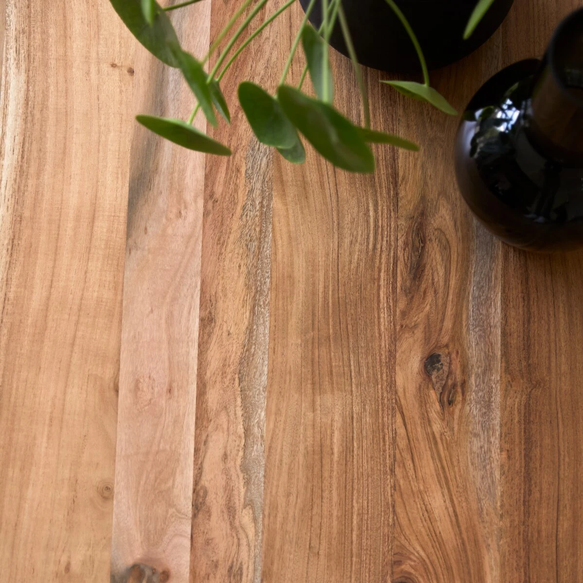The industrial spirit of the Temis table, combines purity of lines and beautiful materials. The solid acacia surface is highly resistant to shocks and heat and has remarkable golden hue that can stand the test of time. The legs have been designed so you can maximise the number of guests who can sit around the table. Match the table with chairs from the Temis collection and complete the minimalist look. Alternatively you could use it as a large desk in a spacious office.