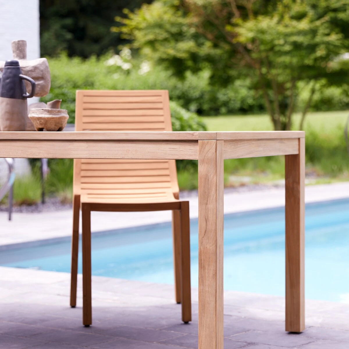 Teo solid teak garden furniture. With its appealing slatted wood – very on-trend in contemporary decors – and the honey tones of wood that works equally well indoors or out, this is garden furniture that you’ll want to place on the terrace to enjoy hours of fun with family or friends in the summer and that you can then convert to indoor use in the living room, dining area or conservatory. Sold here with 4 matching chairs, the table can accommodate up to 8 guests: ideal for large families or evenings with friends!
