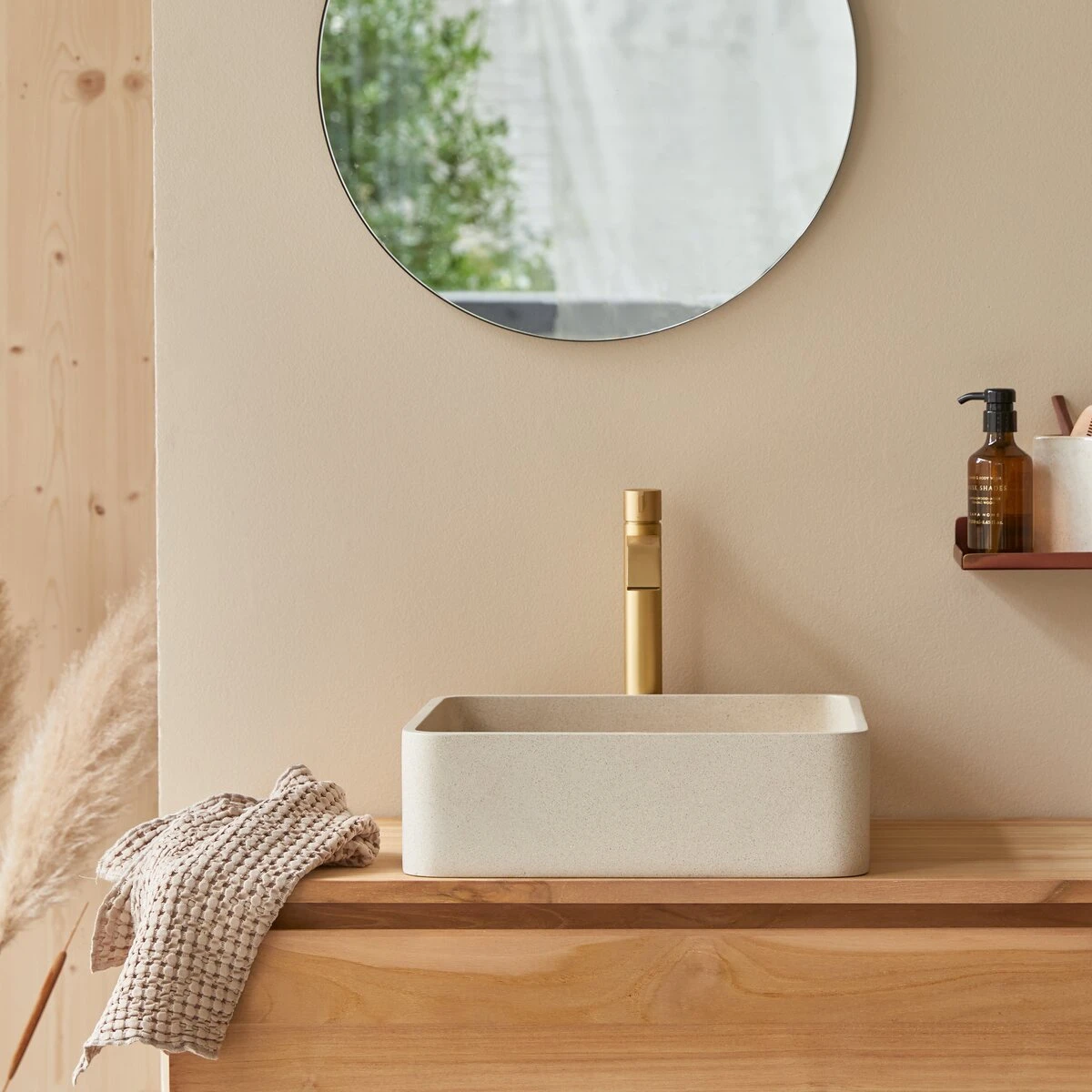 The Thaïs square cream terrazzo washbasin is so stylish! We like the terrazzo effect created by the gorgeous speckled appearance, the material that designers can’t get enough of, and the softened lines. Its uncluttered design makes it versatile enough to be paired with any type of furniture, and in the blink of an eye, the atmosphere of the room is transformed.