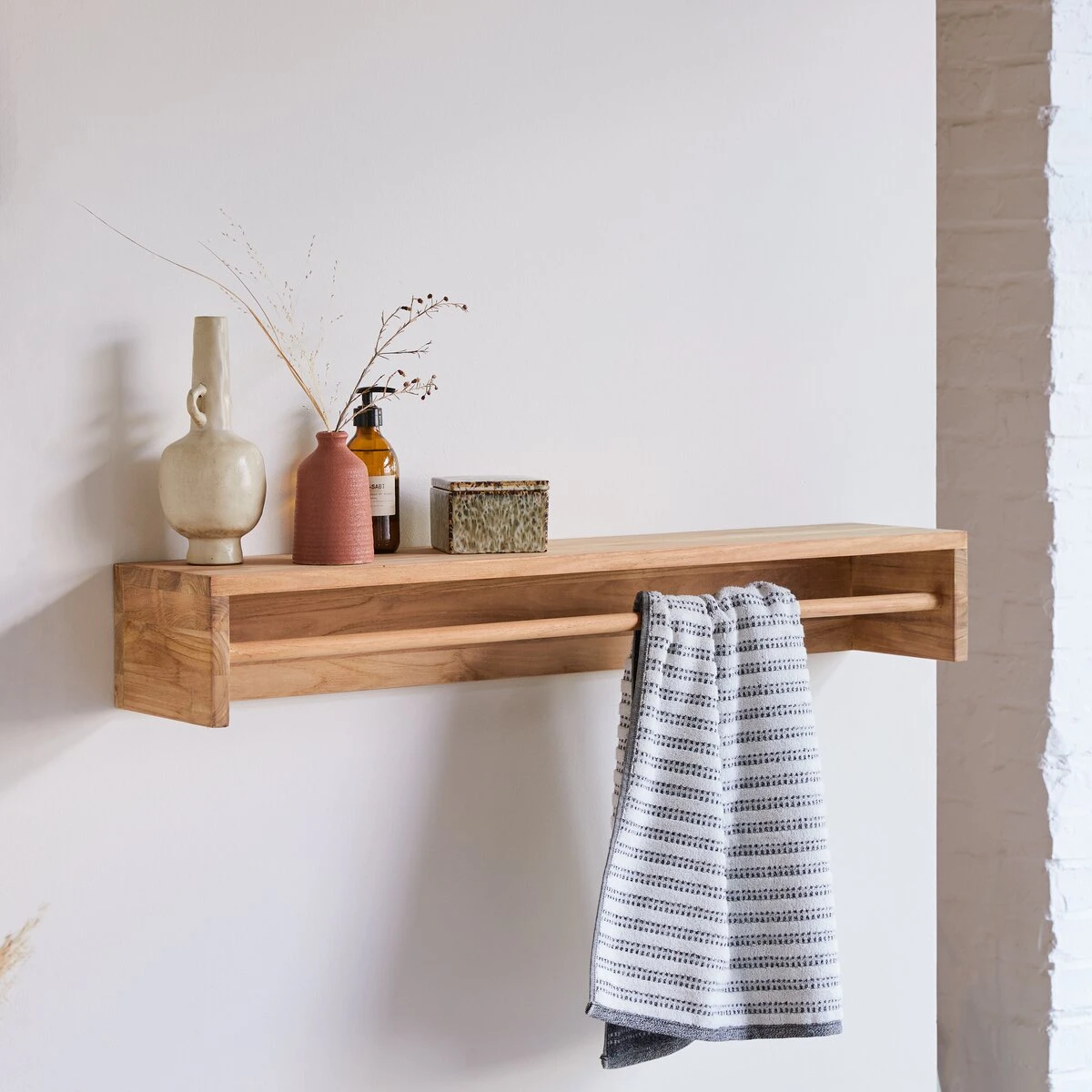 The Ugo 100 in FSC® certifiedsolid teak bathroom wall shelf has a stylish and clever design… It is a versatile a 2 in 1 shelf, which makes it very useful!